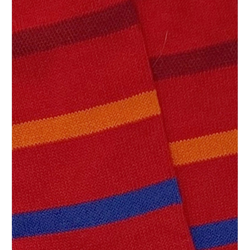 82% English combed cotton, 18% nylon with just a touch of elastane in the top to keep them up all day long. Mid-calf length. Brilliant fit and durability whilst preserving colour wash after wash.