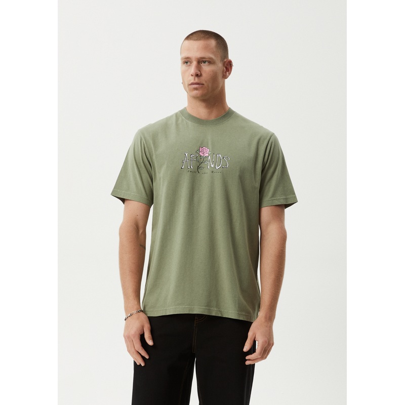 AFENDS Mens Smell The Roses – Retro Tee – Oil Green