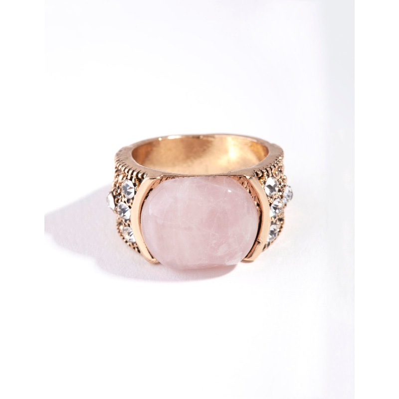 Raise your ring game with this stunning boho-style gold-toned ring, which features a large statement pink-hued stone. There’s an ornate pattern on either side of the ring, and its studded with diamantes for extra sparkle. Slip into another time with this gorgoeus antique design.