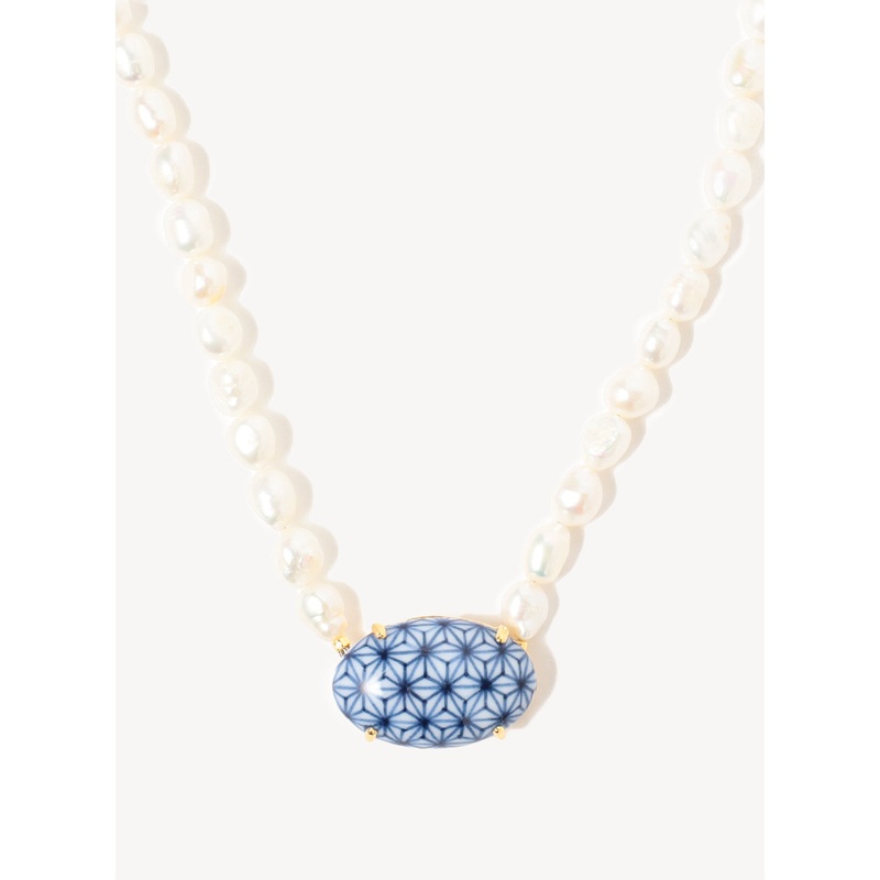 This long motif necklace features Arita warea fine Japanese porcelain known for its luminous white translucence and delicately hand-painted traditional patterns. The elegant contrast between the smooth, round porcelain and the natural irregularity of freshwater baroque pearls creates a refined and expressive silhouette.