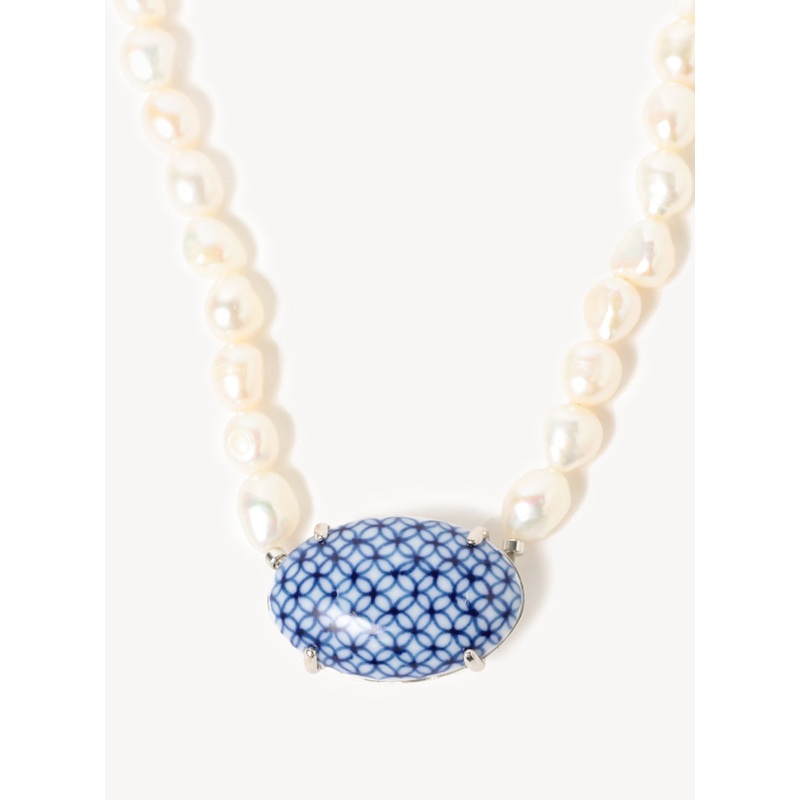 A shorter strand of lustrous freshwater pearls is anchored by a striking oval porcelain centerpiece, adorned with a hand-painted indigo lattice motif. This necklace offers a refined yet artistic finish to both casual and formal ensembles.