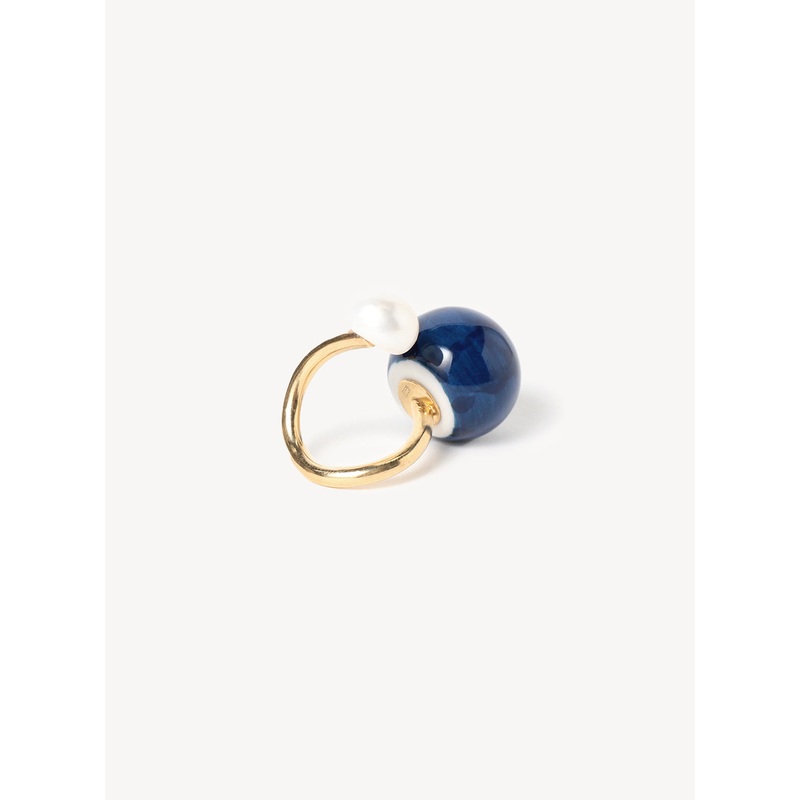 This handcrafted ring captures the essence of Arita ware with its signature blue glaze and the addition of a luminous freshwater baroque pearl. The porcelain is decorated using the traditional dami technique, in which outlines are first drawn, then filled in with a brush dipped in rich Gosu pigment. Pressing the brush by hand allows for subtle gradients and shading, creating a uniquely dimensional finish reminiscent of a hand-colored painting.