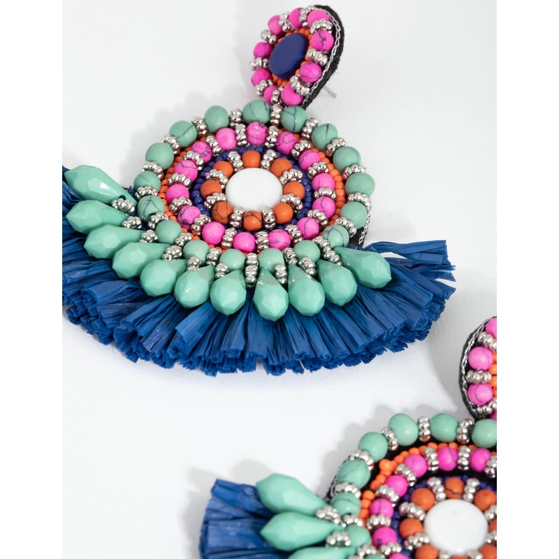 Make a statement with these ornate earrings! They boast an impressive drop, exceeding 8.5cm. They feature detailed beading in vivid pink, green and orange tones as well as paper tassel details. Pair them with white for a resort luxe look, or go bold and wear them with colour!