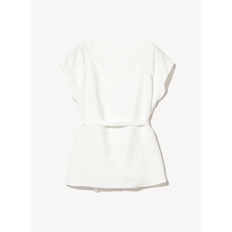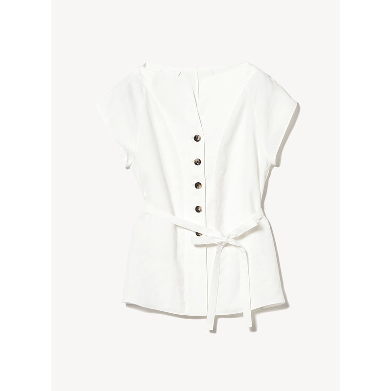 This elegant white blouse features a clean front-button design with a soft V-neckline and a cap-sleeve silhouette, offering a refined, effortless feel. The detachable waist tie allows for adjustable styling, giving you the option to cinch the waist for a more defined shape or leave it relaxed for a minimalist look.