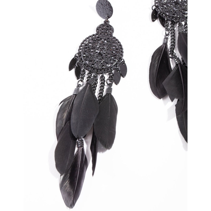 Statement earrings are the easiest way to switch up your wardrobe! Conversation-starting styles mean that a new pair of earrings replace the need for a new dress. These earrings feature a black cascading feather design. Style with black rings, sleek hair and a bold lip for a dramatic look.