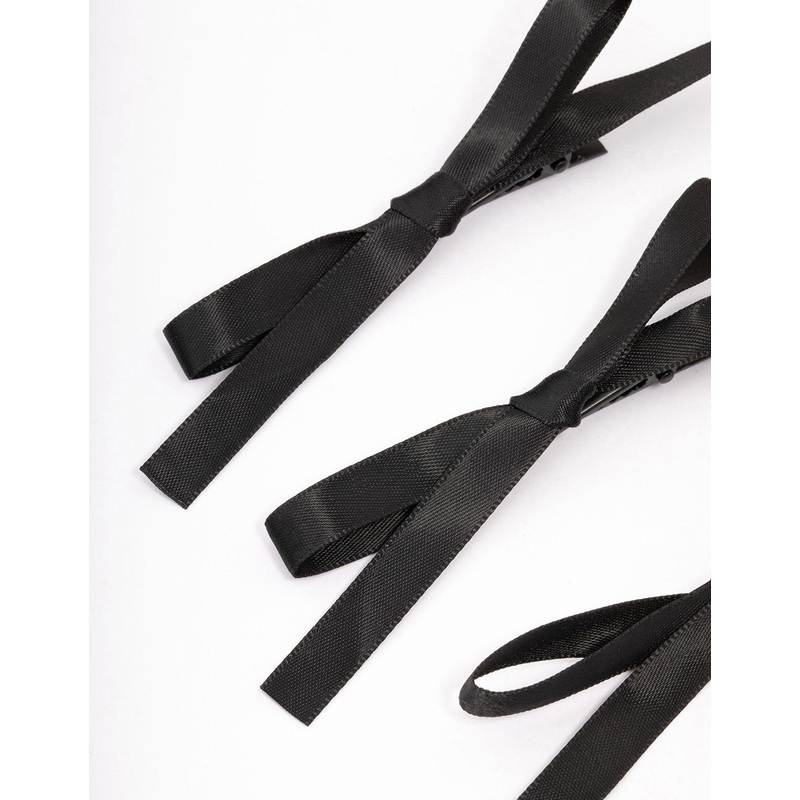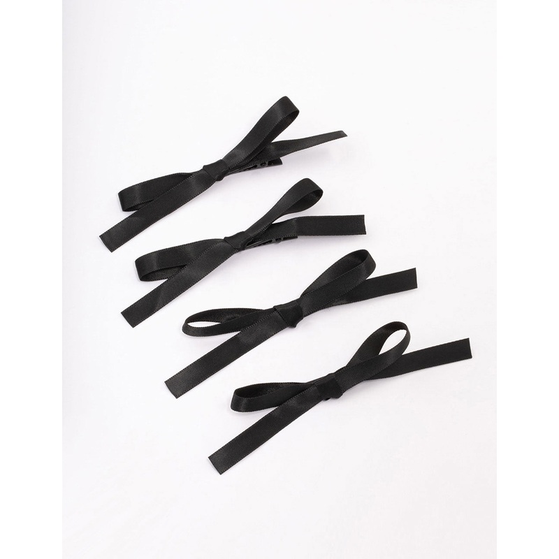 • This hair accessory pack contains four, thin black hair bows for a coquette-inspired finish to your look.