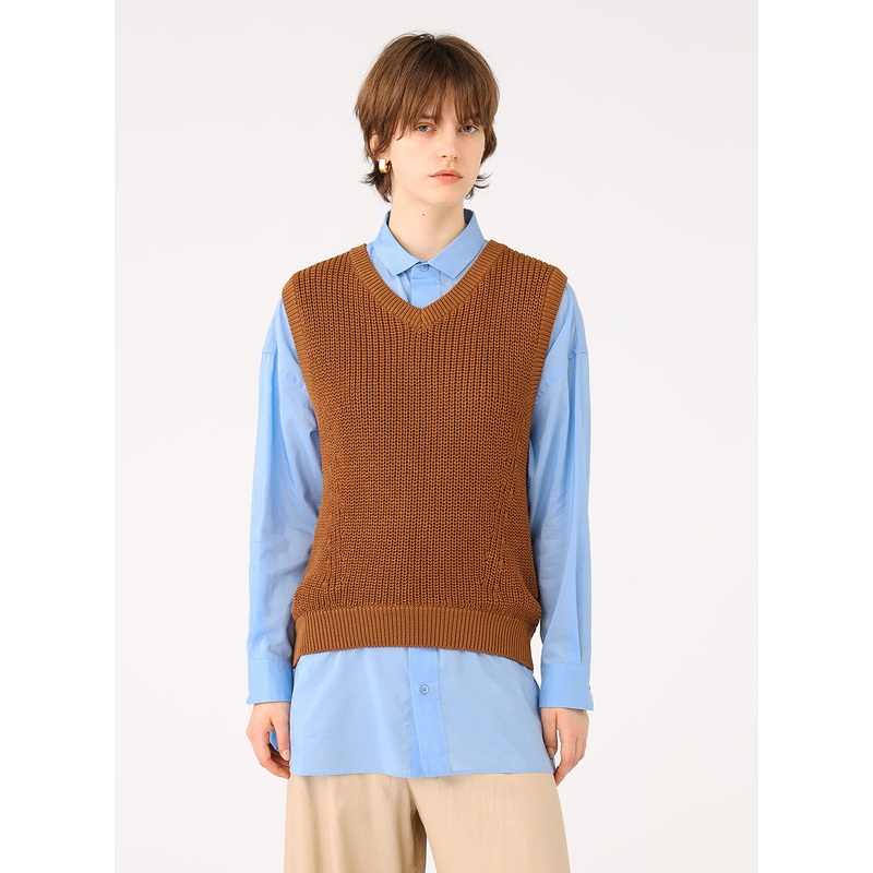 Cotton V-Neck Ribbed Knit|Camel|One Size