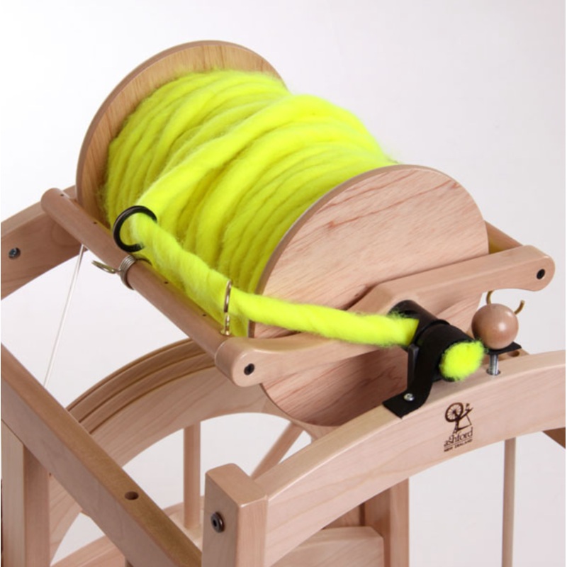 This is a specialist wheel designed to spin art yarns, extra bulky yarn used in rug weaving and chunky knitting or for plying bulk quantities. Extra-large orifice with slow drive ratios and sensitive leather flyer brake system are ideal for creating unique art yarns.