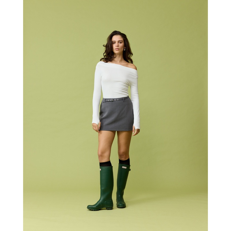 Off-shoulder long sleeve knitted top crafted in a mid-weight knit. This top is simple yet elegant and can be worn on or off the shoulder.