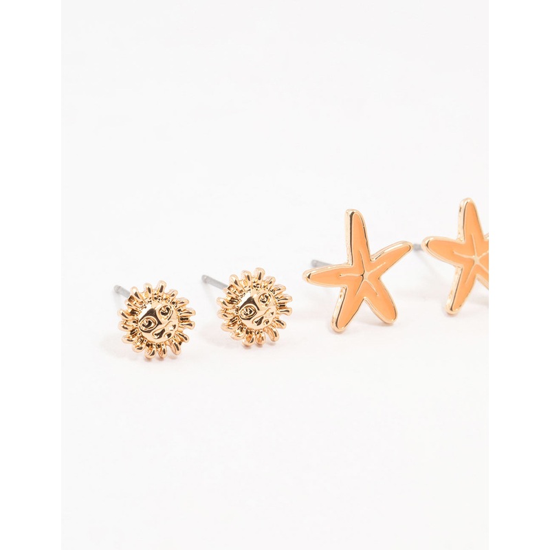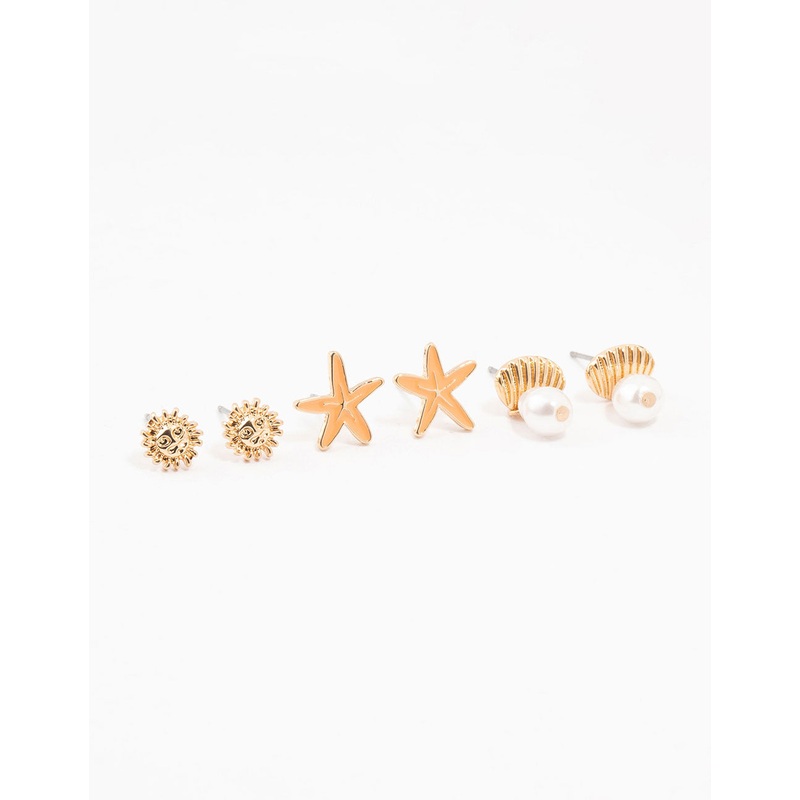 Bring some beach inspired glam with this set of gold earrings. This playful trio includes shells, sun and starfish motifs, perfect for adding some island charm and sophistication to any look, taking you from day to night with a touch of sunny, sandy flair.
