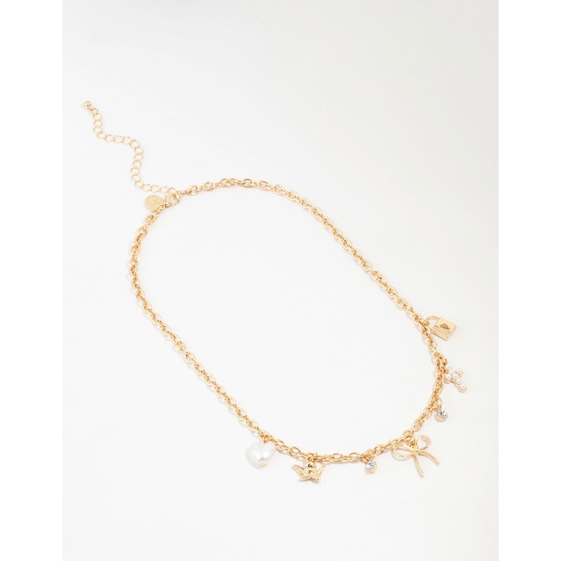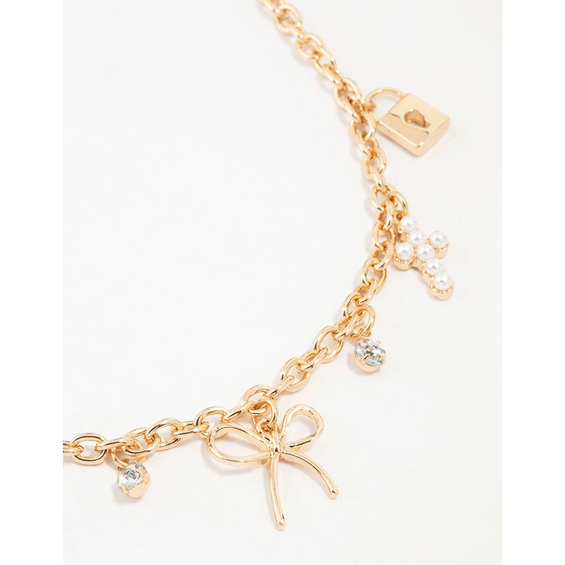Instantly upgrade your style with this gold-toned charm necklace! Featuring bows, crosses, a lock, and sparkling diamante crystals, it’s perfect for a playful yet sophisticated vibe.
