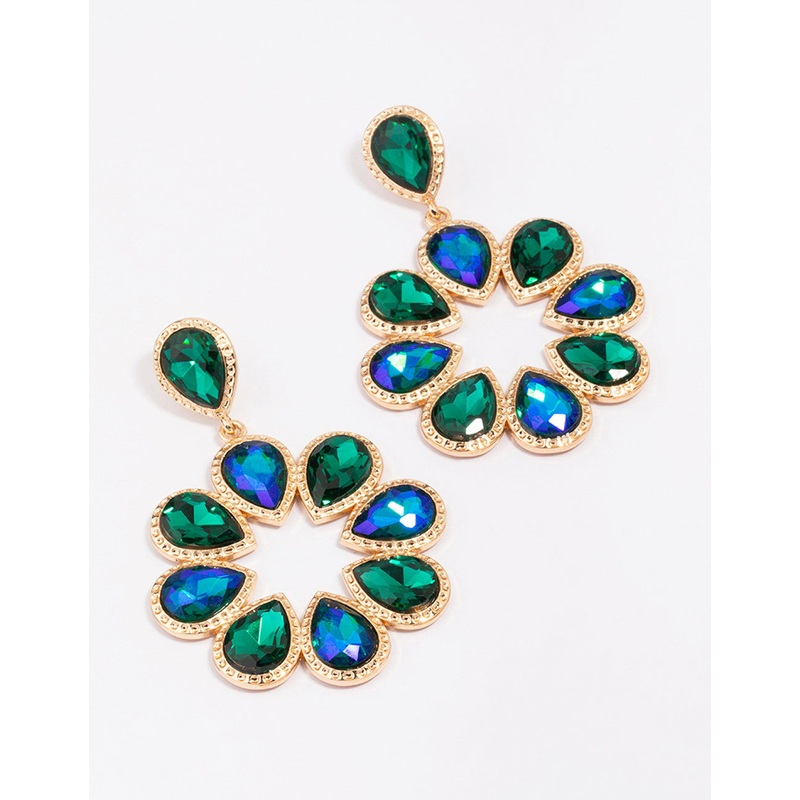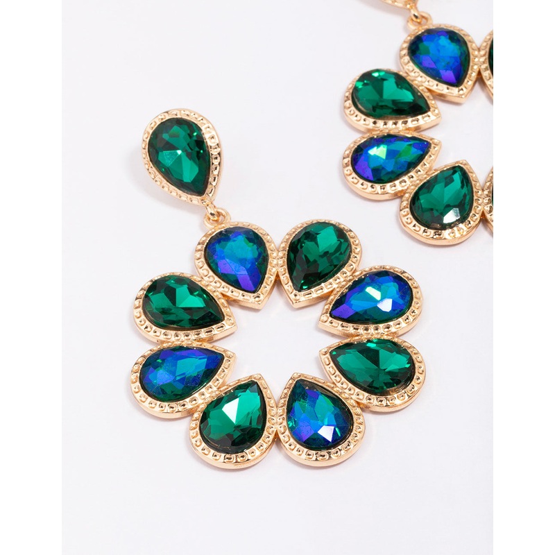 Channel 1920s glamour with these gorgeous, gold-toned drop earrings. These unique statement earrings feature a round design, encrusted with emerald and sapphire-coloured stones for an opulent finish.