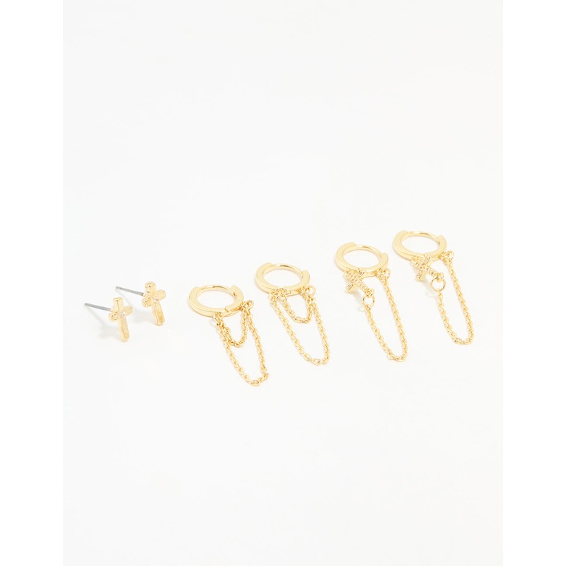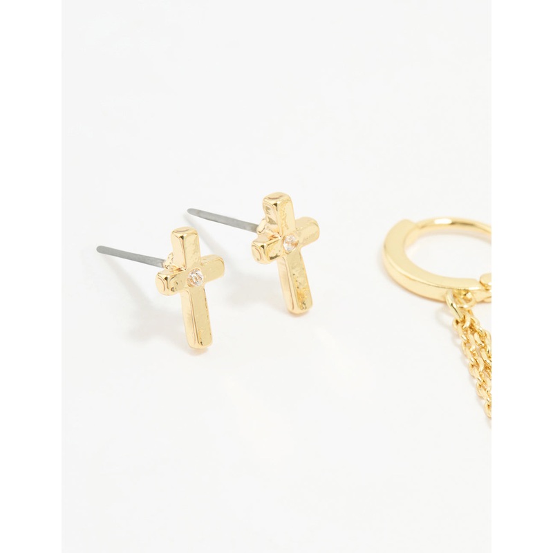 Gold Cubic Zirconia Loop Chain Cross Earrings 3-Pack