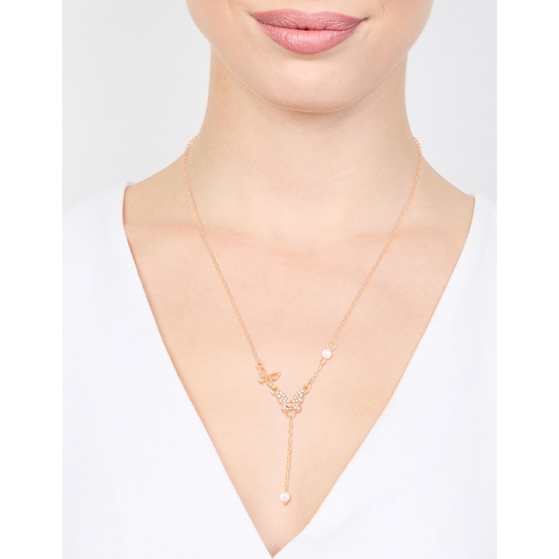 This stunning y-neck designed necklace features a delicate gold toned chain, sparkling diamantes, elegant pearls, and charming butterfly pendants for an elegant touch to any ensemble.