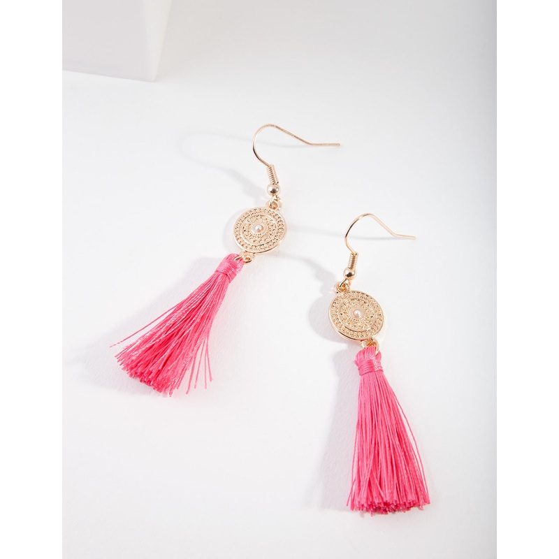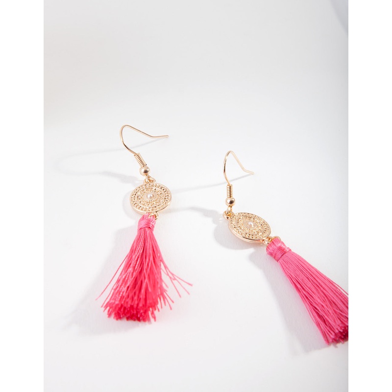 Gold Disc Pink Tassel Drop Earrings