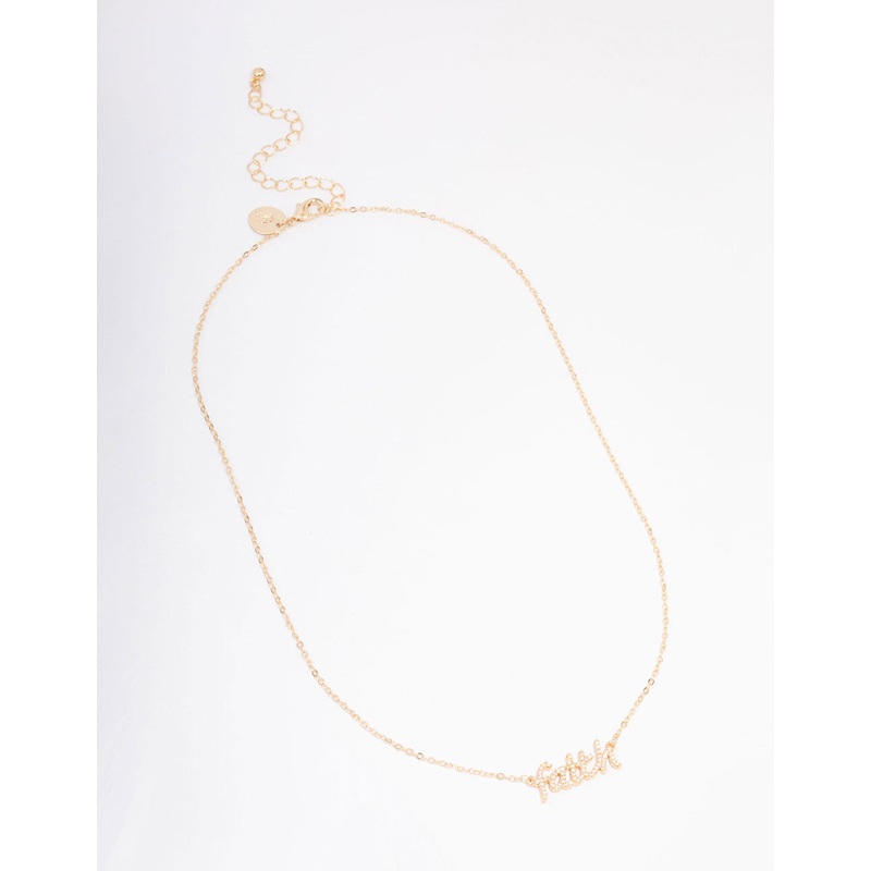 • This script pendant necklace features a timeless gold setting that spells the word faith. Pair this simple pendant with a set of simple diamond studs for a polished and understated look.