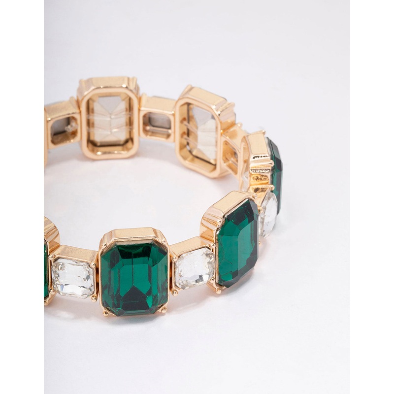 This stretchy bracelet features a pattern of hexagon-shaped, crystal and emerald-coloured stones.
