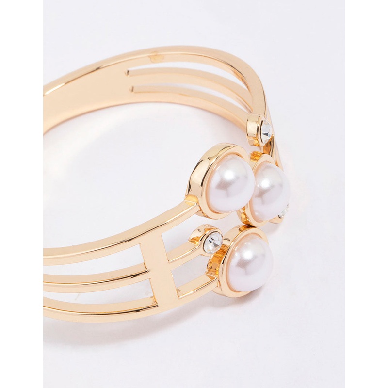 Embody sophistication with this gorgeous, gold-toned bangle. This unique bangle features a hinged clasp and pearl detailing on the front for an elegant finish to your stack.