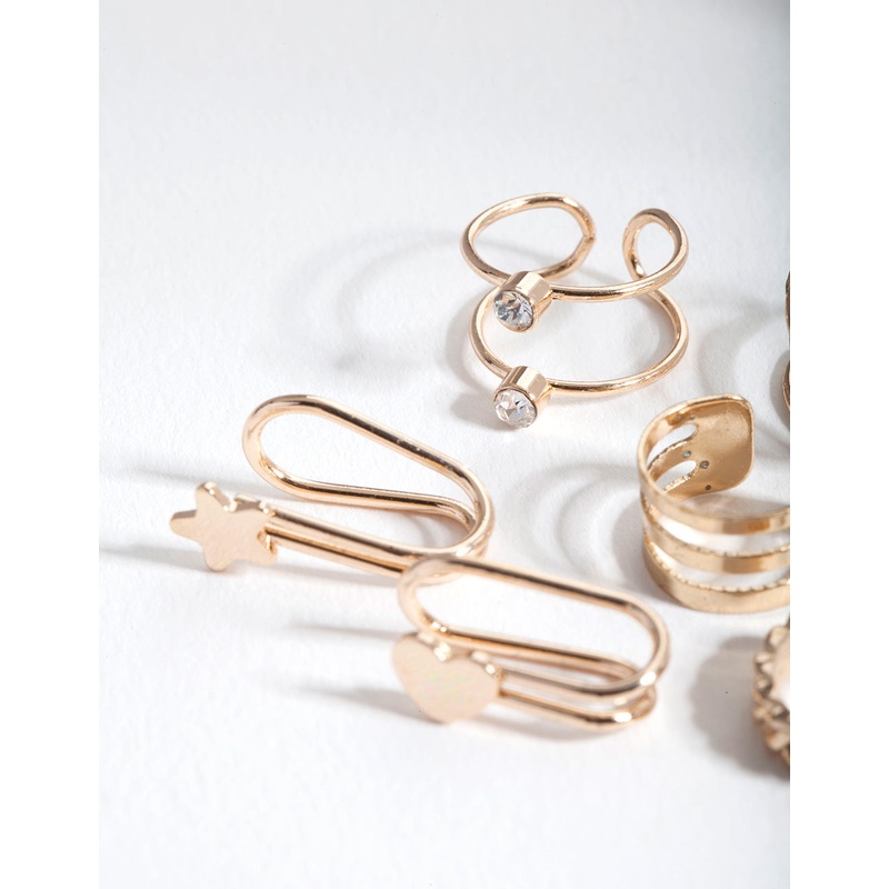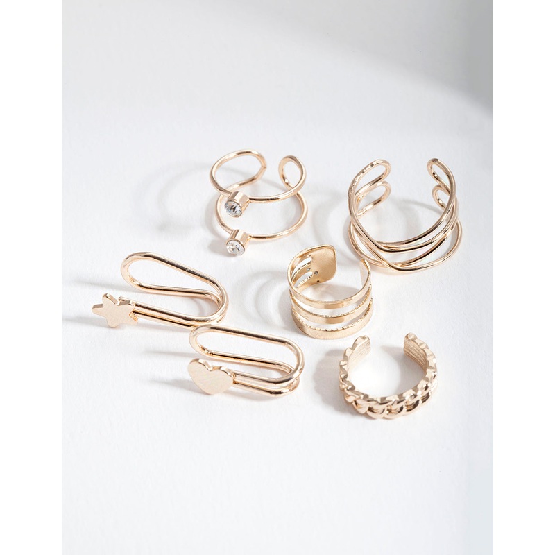 Complete your outfit with an ear cuff pack. This design features a gold-toned setting and textured finish so you can get the look without the piercings. Wear the ear cuff set on it’s own or stack multiple piercings with other gold-toned designs (eg. hoops, huggies, studs etc.)