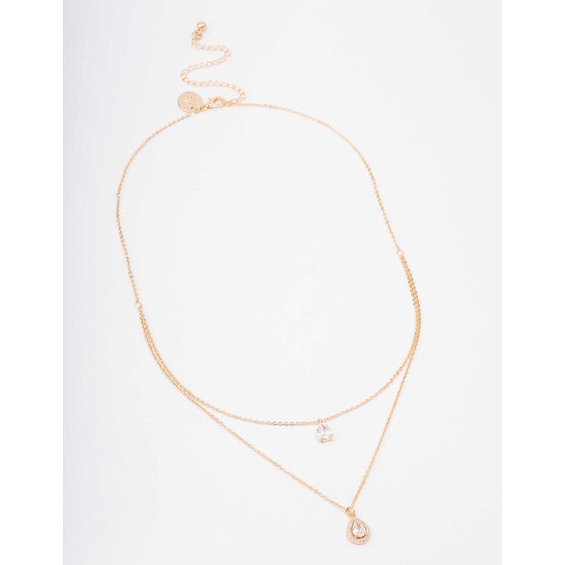 This layered necklace features a round diamante charm and halo pendant for a timeless look.