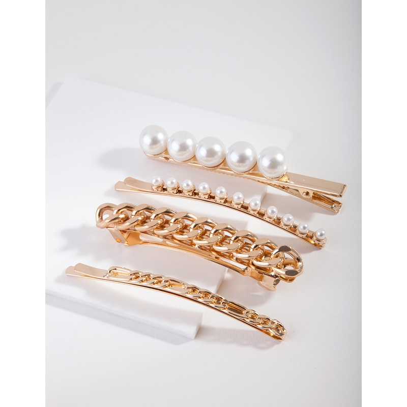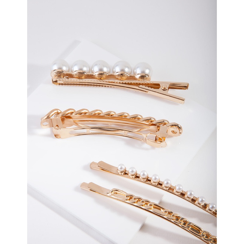 Pearl hair accessories are perfect for those wanting to create a timeless occasion look. These lovely gold-toned pins feature faux pearl and chain designs. Draw attention to your luscious locks with this hair clip pack.