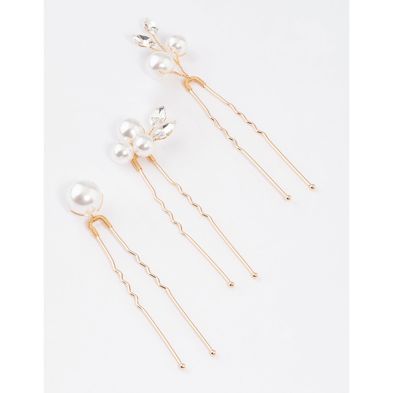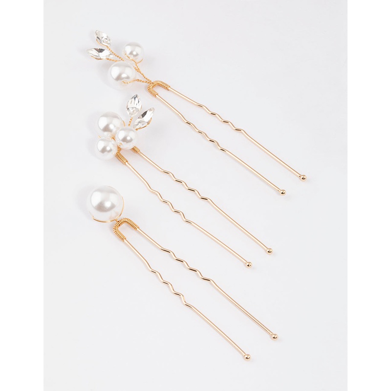 - This hair pin pack contains three individual, gold-toned, pearl-embellished hair clips – perfect for placing in a bun or pinning the hair back.