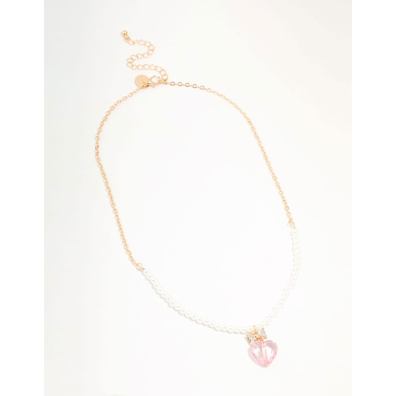 Gold Pearl & Pink Faceted Bead Heart Necklace