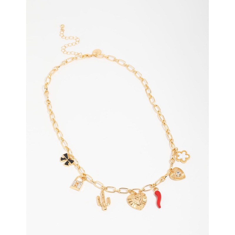 Add a playful twist to your jewellery game with this Gold Plated Chilli & Cactus Charm Pendant Necklace. Crafted with a gold plated finish, this pendant necklace features a quirky mix of charms: a cactus for fun vibes, a protective chilli, a flower, and a diamante-centred ribbed heart for a touch of sparkle. Perfect for layering or wearing solo, it’s ideal for casual brunches, festivals, or adding character to your everyday look. Pair it with a flowy dress or jeans and a tee for effortless charm. Whether you’re after a unique necklace, a charm necklace, or a standout gold plated pendant, this piece has you covered with its stylish and curated design.