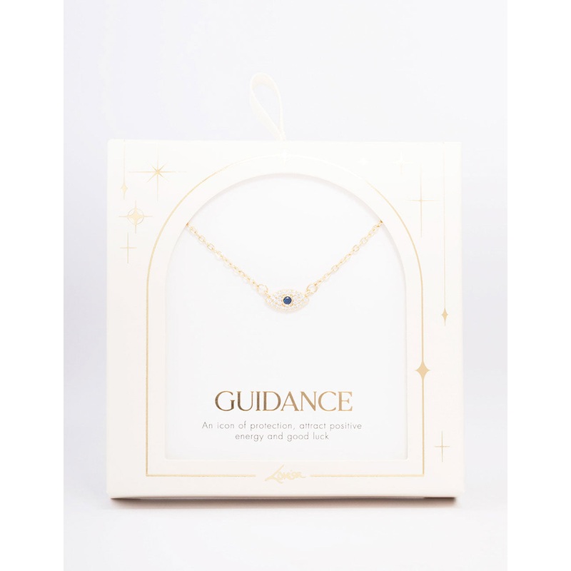 This gift set features a gold plated pendant necklace adorned with a cubic zirconia encrusted evil eye charm for a touch of glamour.