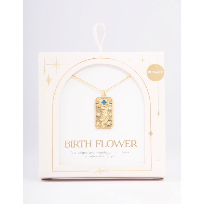 This gift box contains a gold plated pendant necklace featuring a Narcissus floral design and turqouise cubic zirconia crystal, representative of the December birth month.