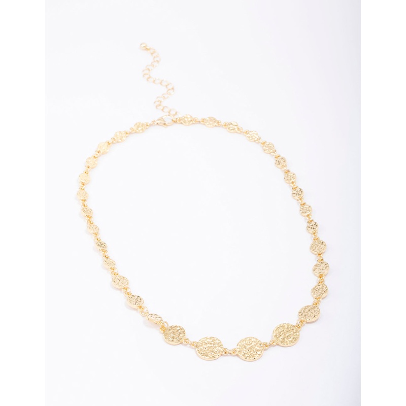 This gold plated necklace features a simple chain adorned with hammered discs for a textural finish to your outfit.