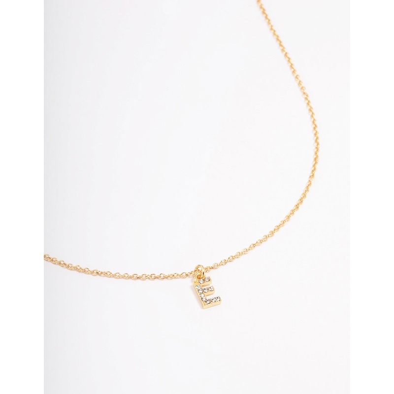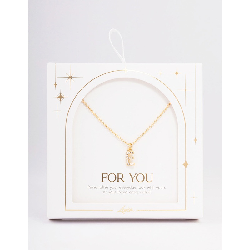 - This gift box contains a gold plated pendant necklace with a diamante-encrusted initial pendant of the letter ‘E.’