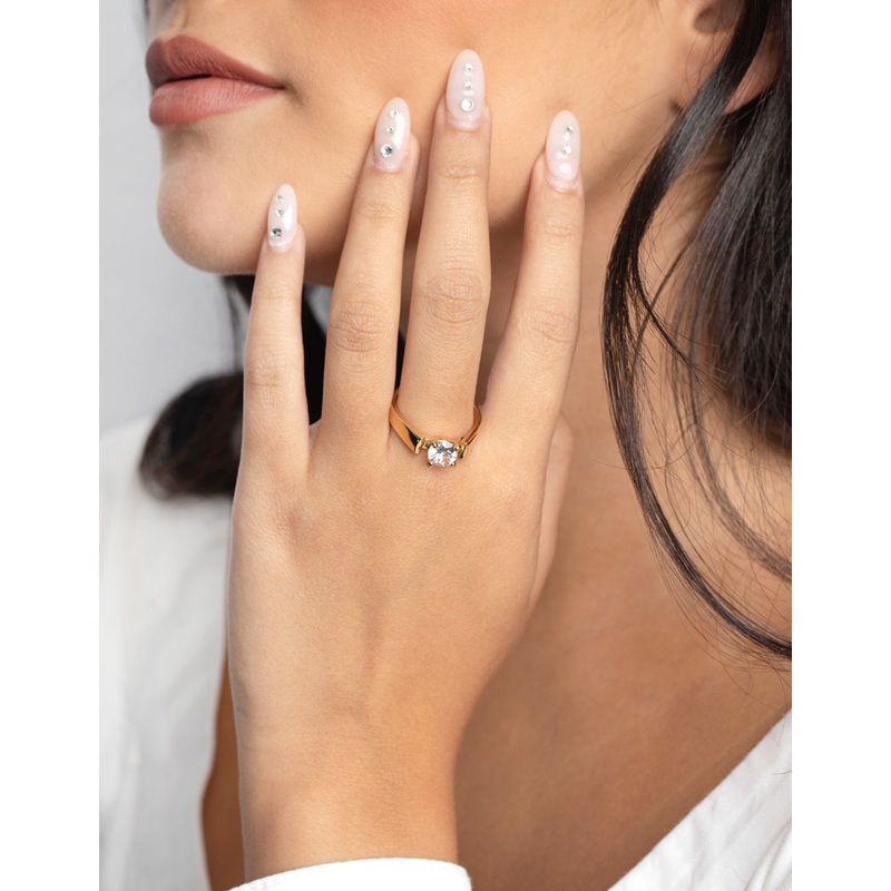 This stunning engagement-style ring has been plated with genuine gold for authentic lustre and shine. It features a statement cubic zirconia crystal, which will dazzle when it hits the light. Cubic zirconia crystals have been specifically created to resemble the cut, colour and clarity of true diamonds. Wear this ring and make and impression, or gift it to a special someone.