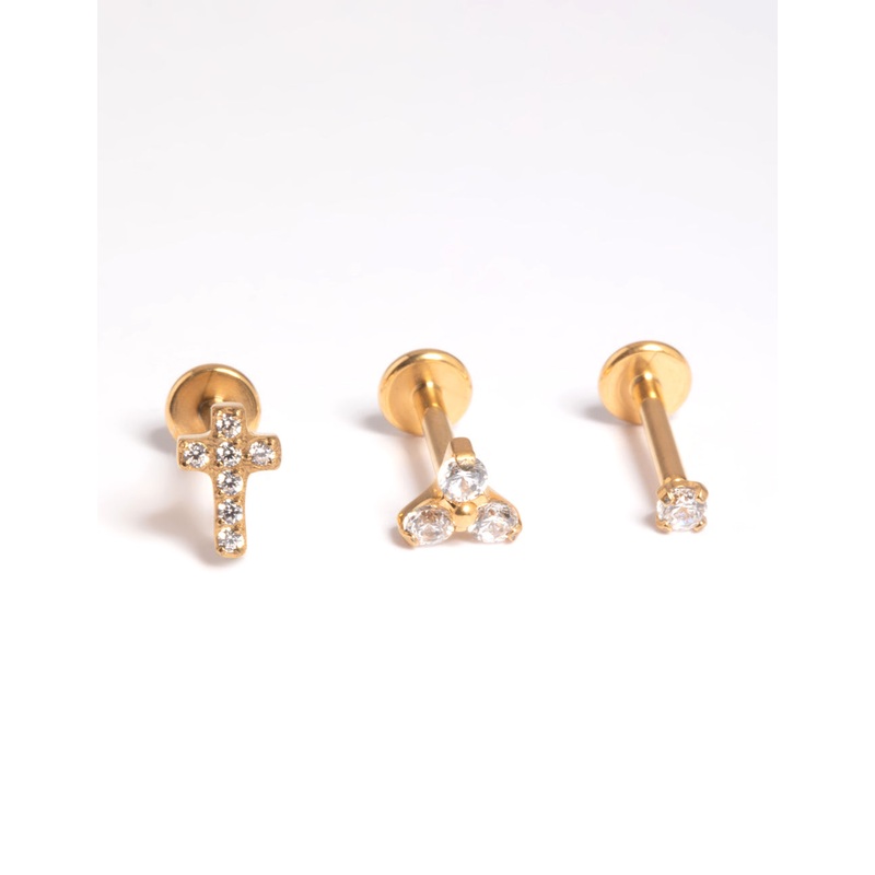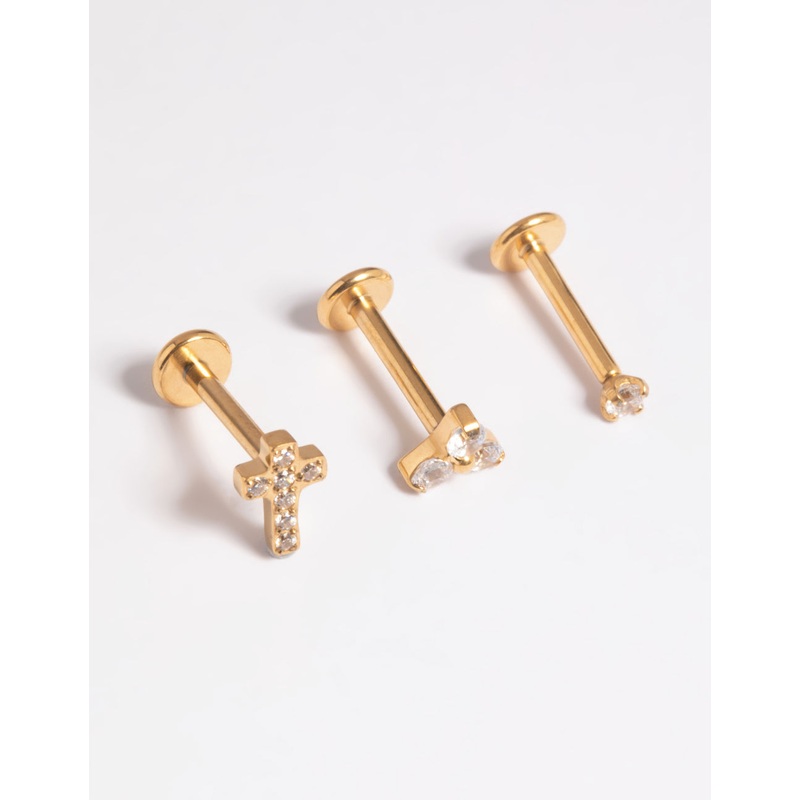Gold Plated Titanium Threadless Cubic Zirconia Cross Flat Back Pack