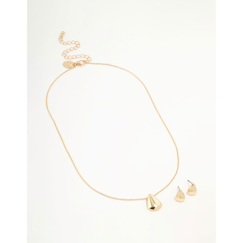 Surprise your special someone with this minimalistic set. This stunning ensemble includes a gold-toned teardrop pendant necklace and matching earrings. It is perfect as a timeless and effortlessly cool gift.