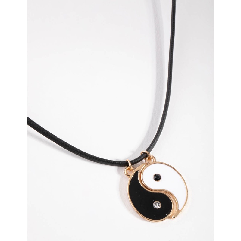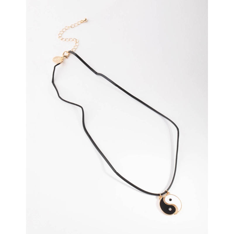 Embrace 90s trends with this funky cord necklace! It features a split yin yang symbol that comes together to make a whole.