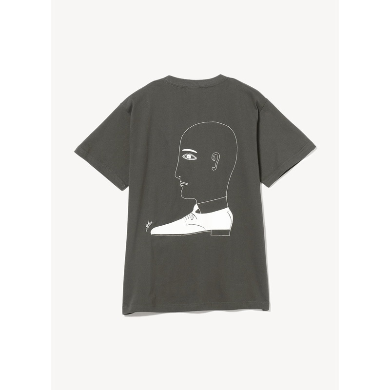 This charcoal-colored T-shirt showcases surrealist line art across both the front and back. The front features a minimalist illustration of a figure balancing a long object, while the back presents a striking profile of a human face seamlessly morphing into a shoean imaginative and unexpected visual.
