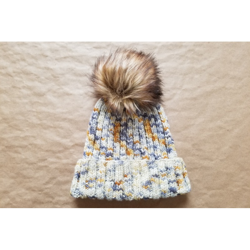 These cozy hats are hand knit in our Selkirk Worsted yarn. They are soft, squishy and super warm. They have a folded up brim to keep ears extra toasty. the pompom (faux fur) is snapped on so it can be removed when you need to wash your hat.