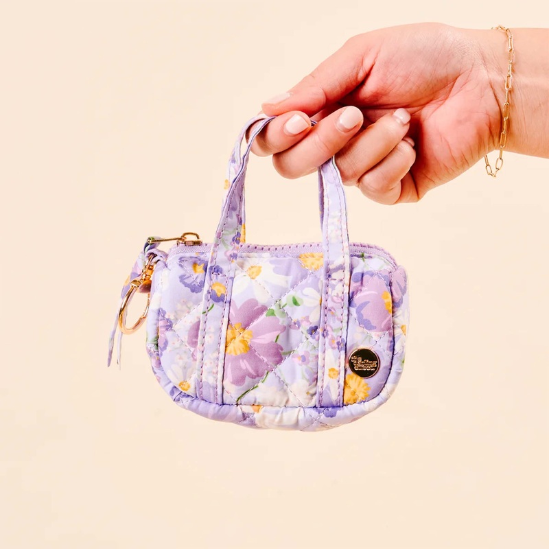 Add a pop of floral charm to your bag or keys with this adorable mini duffle keychain! This quilted keychain purse features a purple and yellow flower print, gold-tone hardware, and a secure zip closureperfect for holding small essentials on the go. Clip it to your tote, backpack, or use it as a stylish standalone accessory.