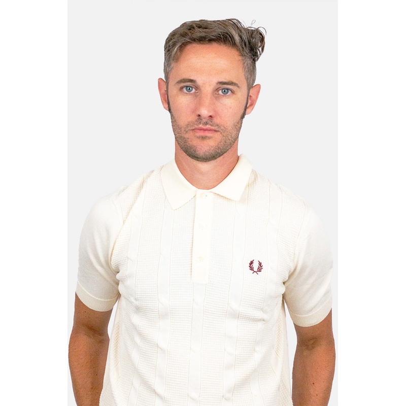 Combed cotton knit/Regular fit/Ribbed trims/Three button placket with high polish buttons/Embroidered Laurel Wreath logo to the left hand chest.