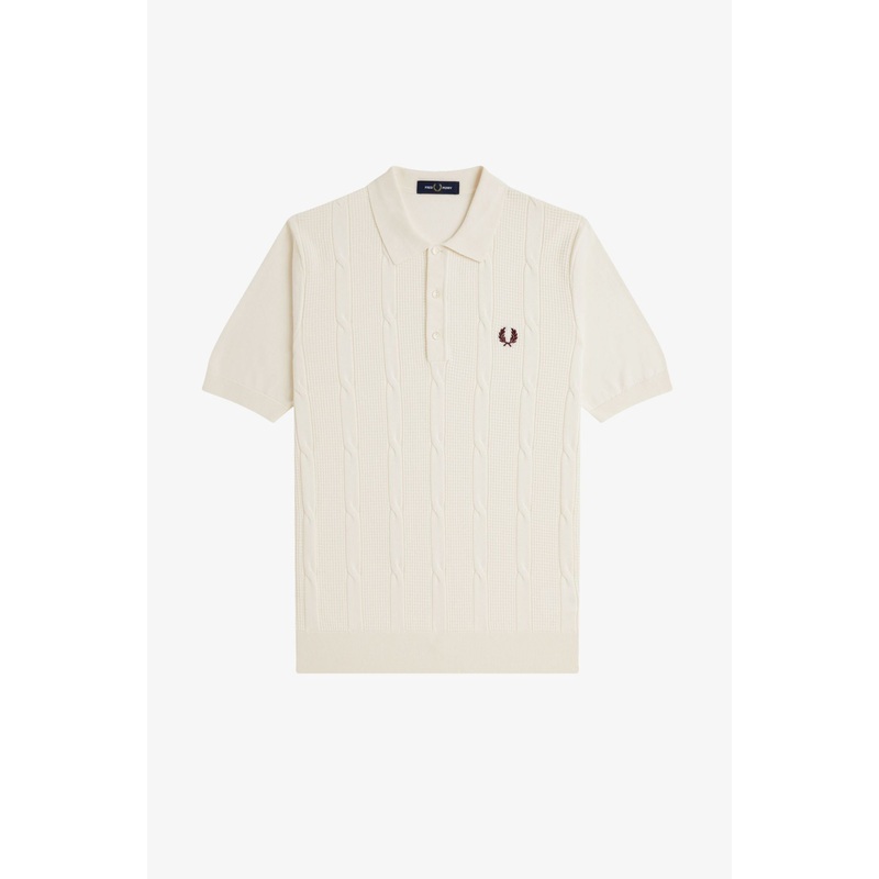 A cable knit shirt that remembers folk guitarists, tennis greats, and grandparents alike.