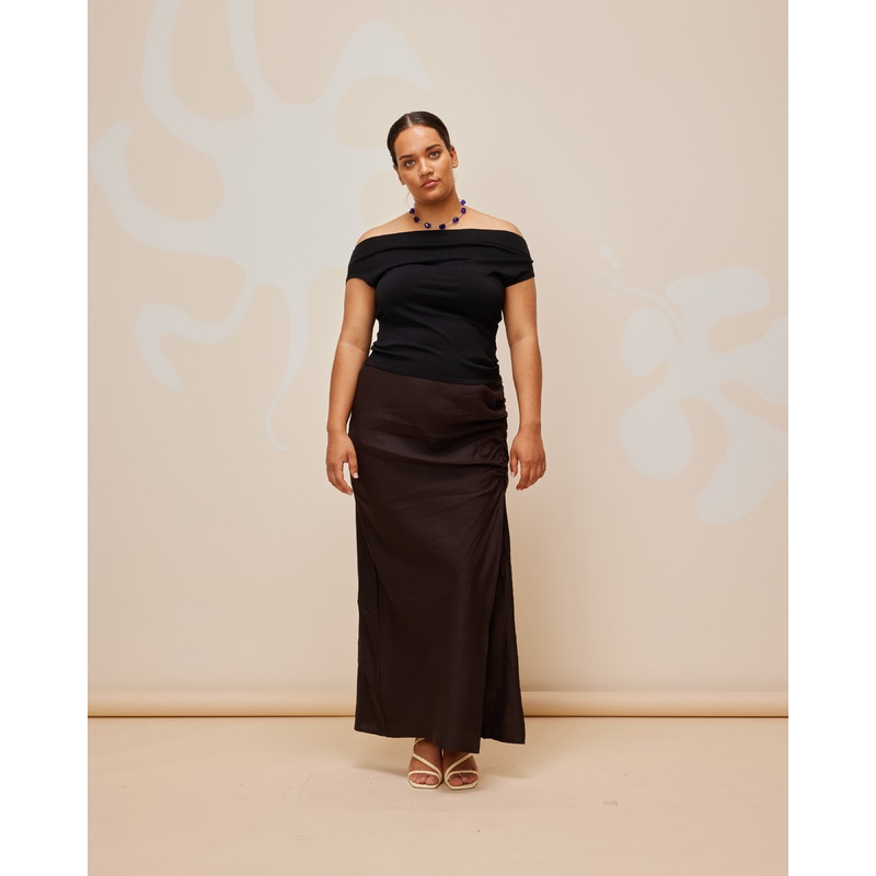 Straight fit midi skirt with a drawstring on one side to create gathering and a side split. Designed in a rich java linen blend.