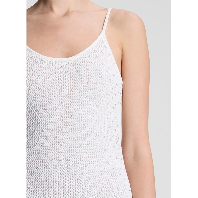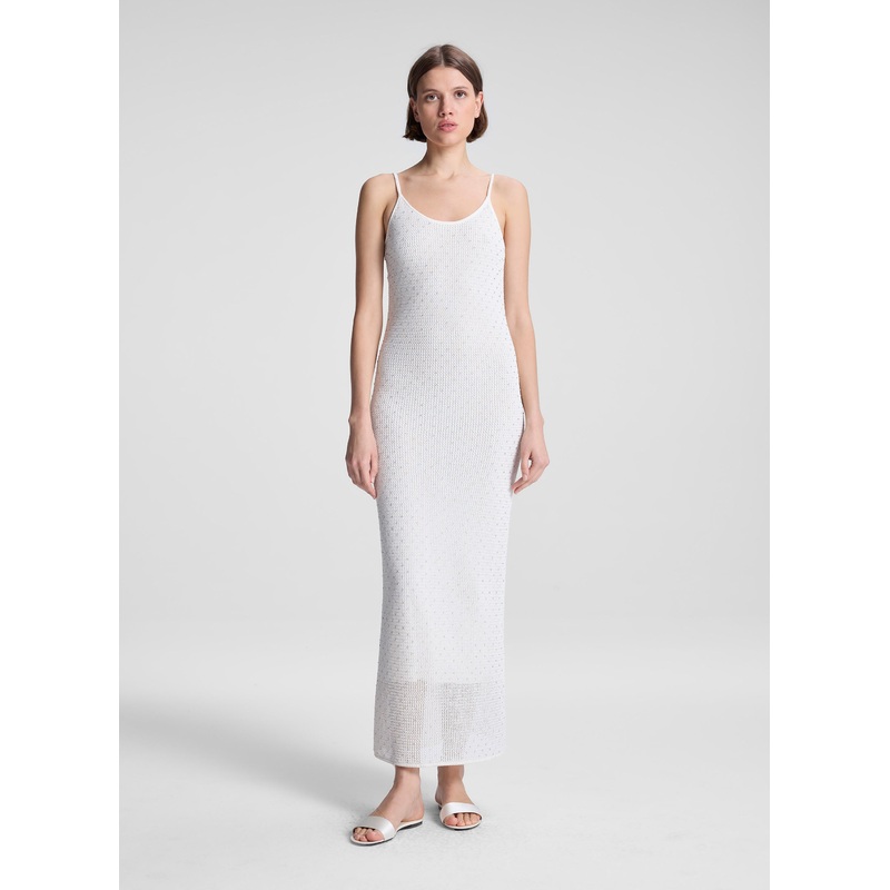 The Lyra Dress is crafted from a soft, open-knit cotton blend in off white, subtly embellished with tonal tiger’s eye cabochons for a hint of texture and shine. This slim, ankle-length silhouette features barely-there straps, a scoop neckline, and an open backcreating a breezy, second-skin fit that balances simplicity with impact. Shop Dresses.