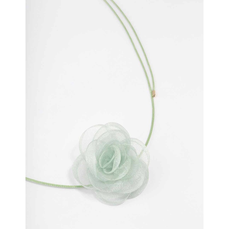 This floral choker features a thin, adjustable cord and floral pendant crafted from a delicate, mint fabric.