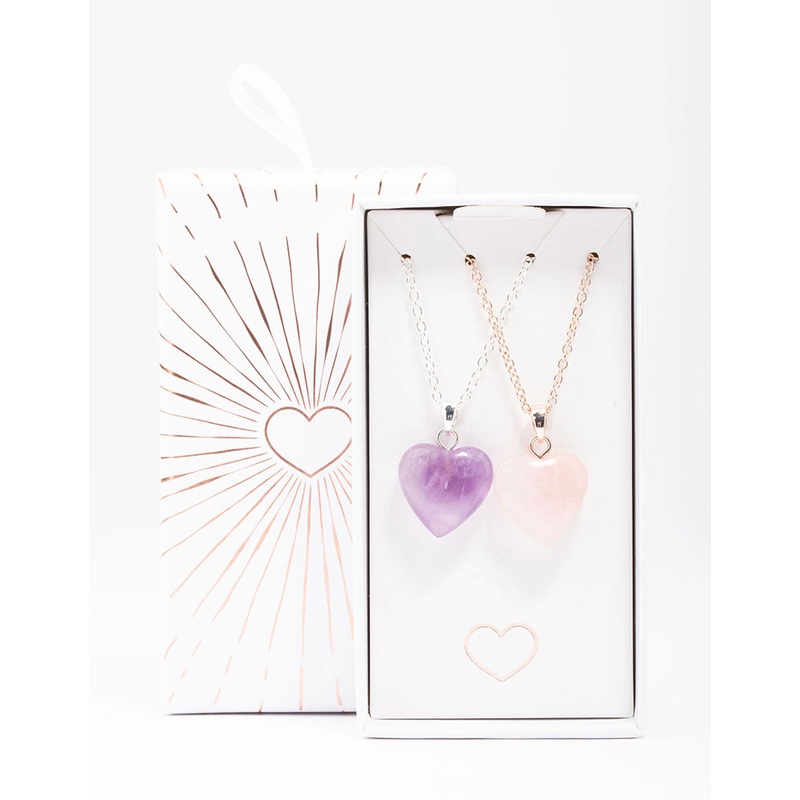This gift box contains two pendant necklaces adorned with rose quartz and amethyst heart charms.