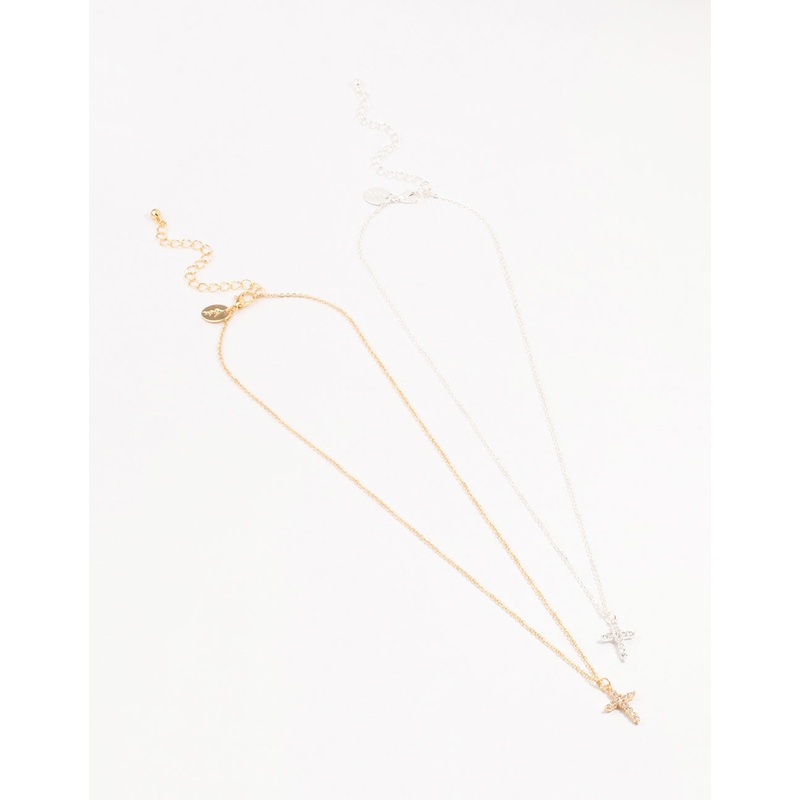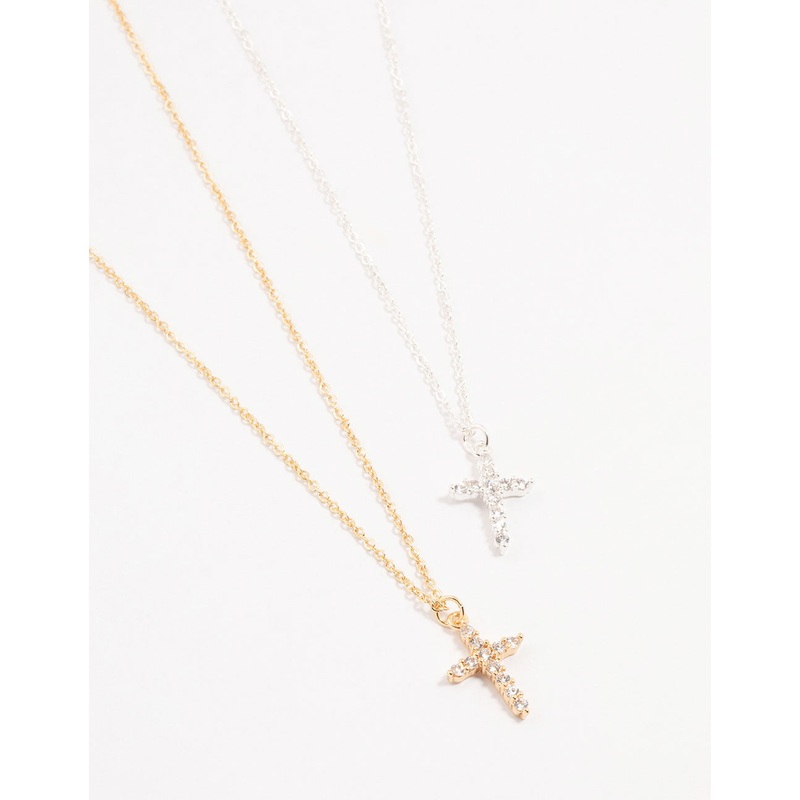 Embrace mixed metal chic with this set of two necklaces! Perfect for layering, they feature gold and silver plated cross pendants, adding a playful twist to your style and making great gifts.