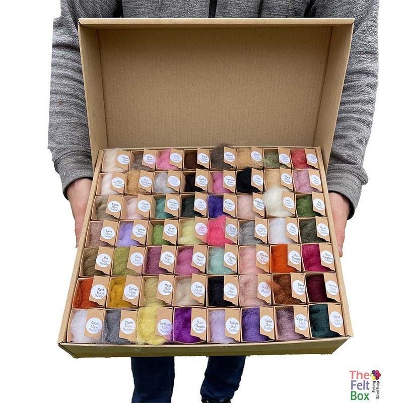 Elevate your needle felting projects with the Maori DHG 56-Colour Wool Palette from The Felt Box. This premium carded wool set features a diverse selection of shades, including vibrant greens, pinks, purples, animal tones, bold oranges, soft beiges, rich browns, and creamy neutrals. Each colour comes in a convenient 7-gram box, making it easy to mix and match for all your creative needs.