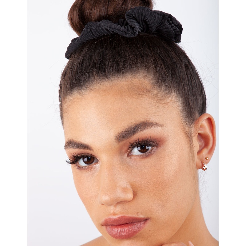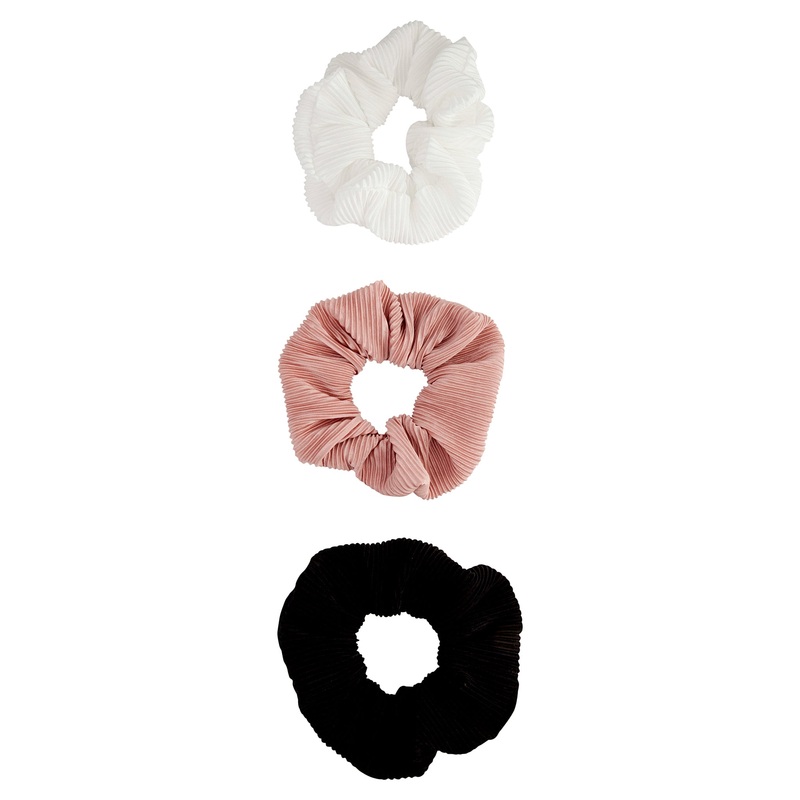 Style our plisse style, neutral scrunchie pack featuring a white, blush and back scrunchie for versatile styling.