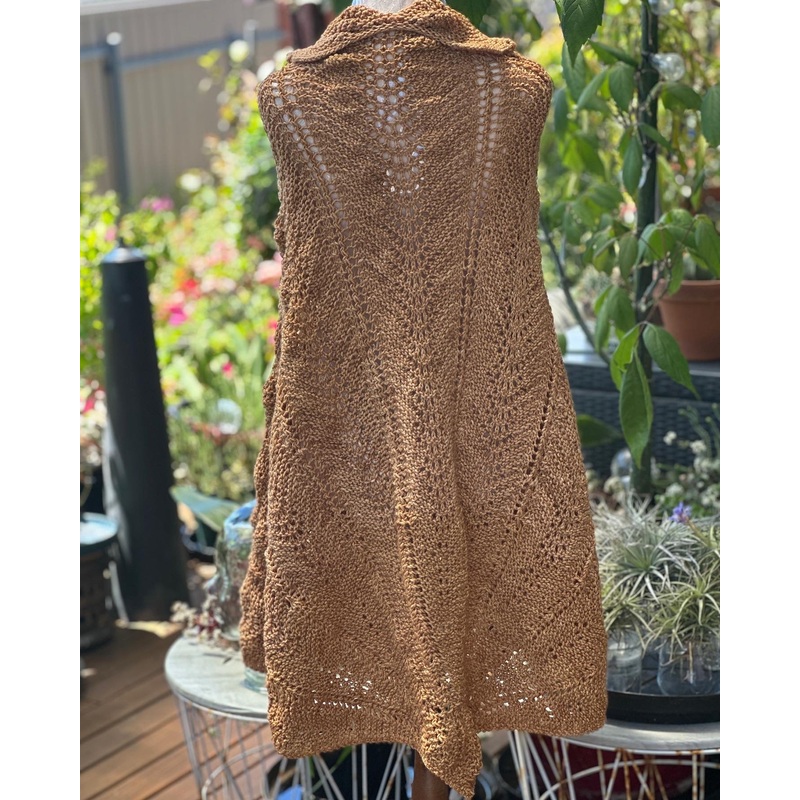 This is a shawl created using a series of lace stiches and normal knit stitches to create a wonderful pattern. The finished look has a fantastic drape.