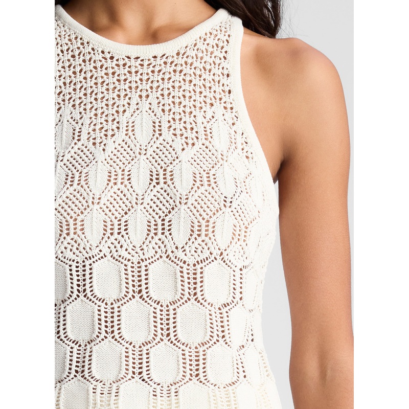 The Rosa Top is crafted from soft cotton and silk yarn in off-white, featuring an openwork pattern inspired by delicate heirloom crochet. This fitted halter silhouette is designed with a high neckline and subtle scallop edging for a refined, vintage-inspired look.Shop Tops.
